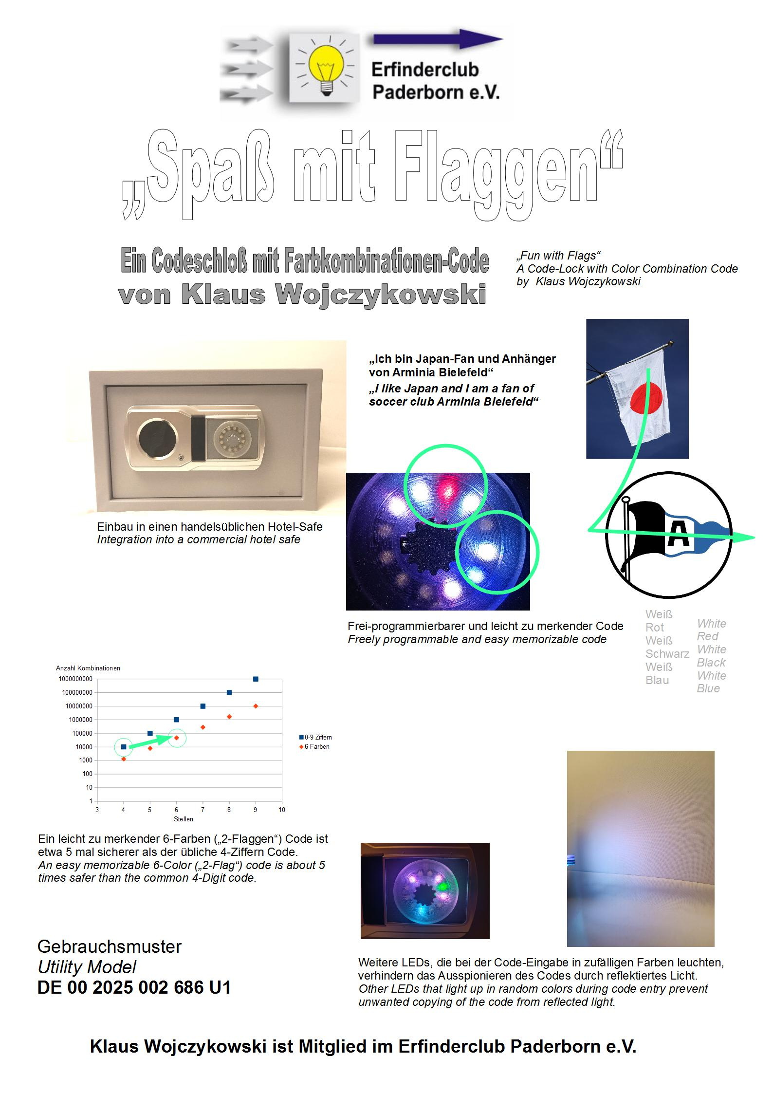 - Codeschloss mit Farben : Klaus Wojczykowski erfand ein Codeschloss für Tresore, bei dem es keine einstellbare Ziffern, sondern Farben gibt. Eine Farbfolge können sich manche Benutzer viel leichter merken, zum Beispiel anhand des Logos ihres Fußballvereins. Ausgezeichet mit einer Bronzemedaille auf der Ideenmesse iENA 2025. Plakat
